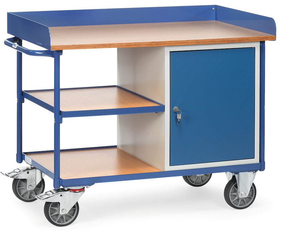 Der stabile Werkstattwagen in sauber verarbeiteter Profilstahl-/Stahlrohrkonstruktion mit hochwertiger Pulverbeschichtung ist mit einer Arbeitsplatte aus Buche-Sperrholz ausgestattet, die dreiseitig mit einer 80 mm hohen Umrandung aus Stahlblech versehen ist. Unter der Arbeitsplatte befindet sich ein Fachboden, der wie die Plattform aus einer im Profilrahmen liegenden Holzwerkstoffplatte liegt, sowie ein erstklassig verarbeiteter Stahlschrank mit Flügeltür, Fachböden und Sicherheitsschloss. Der Schiebegriff besteht aus Stahlrohr.