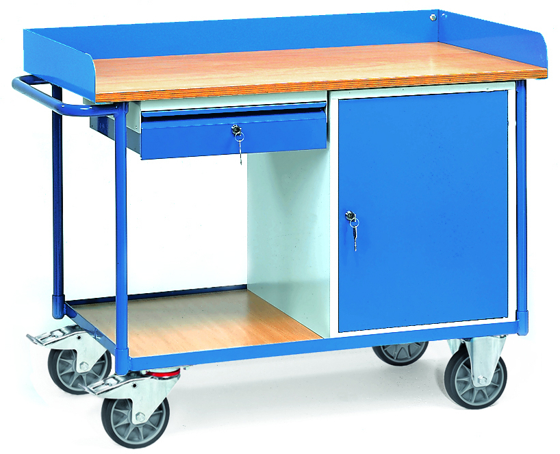 Der stabile Werkstattwagen in sauber verarbeiteter Profilstahl-/Stahlrohrkonstruktion mit hochwertiger Pulverbeschichtung ist mit einer Arbeitsplatte aus Buche-Sperrholz ausgestattet, die dreiseitig mit einer 80 mm hohen Umrandung aus Stahlblech versehen ist. Die Plattform besteht aus einer im Profilrahmen liegenden Holzwerkstoffplatte, Oberfläche Buchendekor, der Schiebegriff aus Stahlrohr. Der Wagen erhält durch einen Schubladenschrank und einen Flügeltürenschrank, jeweils aus Stahl und in erstklassiger Verarbeitung, Stauraum für Werkzeug und ähnliches. Der Flügeltürenschrank ist mit Fachböden und Sicherheitsschloss ausgestattet, der Schubladenschrank ist ebenfalls abschließbar.