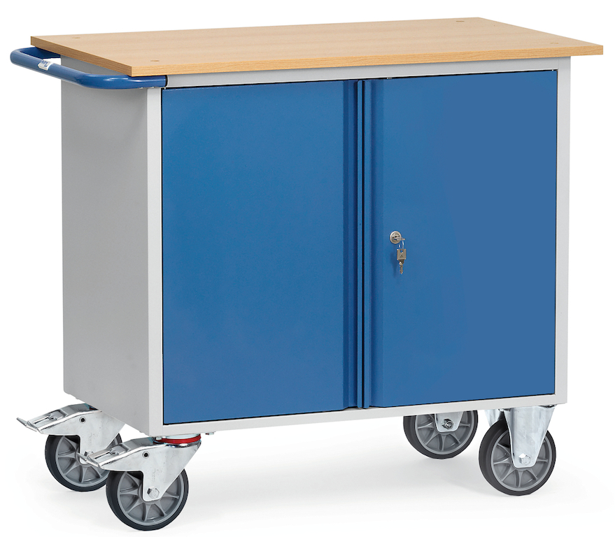 Der Profilstahl-Werkstattwagen in Stahlblech-Konstruktion mit hochwertiger Pulverbeschichtung ist mit einer Sandwich-Arbeitsplatte, Oberfläche Buchendekor, ausgestattet. Der Korpus des Unterbaus ist in grauer Farbe pulverbeschichtet, die beiden Flügeltüren sind blau. Zwei durchgehende Fachböden bieten viel Stauraum. Der Schrank ist mit Zylinderschloss zentral abschließbar.