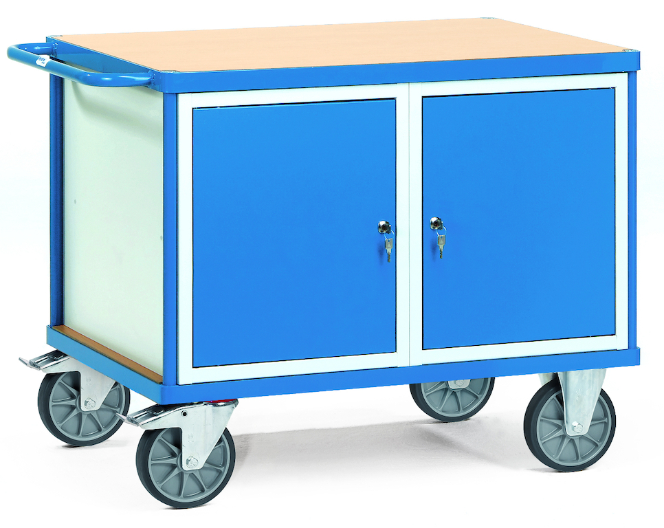 Der stabile Werkstattwagen ist im Baukastensystem in sauber verarbeiteter Profilstahl-/Stahlrohrkonstruktion mit hochwertiger Pulverbeschichtung gefertigt. Die Plattform und die Arbeitsplatte bestehen aus im Profilrahmen liegenden Holzwerkstoffplatten mit Oberfläche in Buchendekor. Der Schiebegriff ist aus Stahlrohr. Die beiden abschließbaren Flügeltürenschränke aus pulverbeschichtetem Stahl sind erstklassig verarbeitet und bieten Stauraum für Werkzeug und ähnliches.
