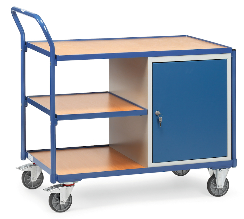 Der Werkstattwagen in sauber verarbeiteter Profilstahl-/Stahlrohrkonstruktion mit hochwertiger Pulverbeschichtung im Baukasten-System ist für den Einsatz im Betrieb auf ebenen Böden bei geringer Belastung (Tragkraft bis 300 kg) geeignet. Plattform, Zwischenboden und Arbeitsfläche bestehen aus im Profilrahmen liegenden Holzwerkstoffplatten mit Oberfläche in Buchendekor. Der Stahlschrank mit Flügeltür und drei Fachböden ist erstklassig verarbeitet und bietet Stauraum für Werkzeug und ähnliches. Der schräg hochgezogene Schiebegriff besteht aus Stahlrohr.