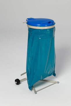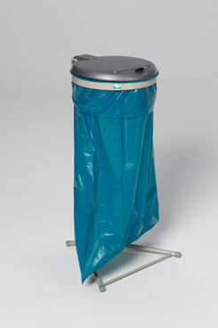 Gefertigt aus Stahlteilen mit hochwertiger Pulverbeschichtung in kieselgrau (ähnl. RAL 7032). Ausgerüstet mit Klemmring, verzinkt, zur Sackbefestigung (Einwurföffnung ca. 350 mm D). Farbige Kunststoffdeckel für eine gezielte Trennung der Wertstoffe.