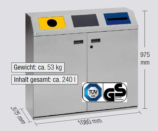 Gefertigt aus verzinkten Stahlblechen mit einer hochwertigen Pulverbeschichtung. Doppelflügeltür mit Doppelbartschloss (1 Schlüssel) und praktischen Griffmulden. Zwei fest montierte Einwurfklappen in gelb, mit Stanzung, rund und blau, mit Stanzung rechteckig und einer selbstschließenden Einwurfklappe in silber bzw. in anthrazit. Mit vier verstellbaren Füßen für einen einfachen Niveau-Ausgleich. Ausgerüstet mit drei Inneneinsätzen aus verzinktem Stahlblech mit Bügelgriffen (Inhalt 3x80 l) und Kantenschutz im Bodenbereich.