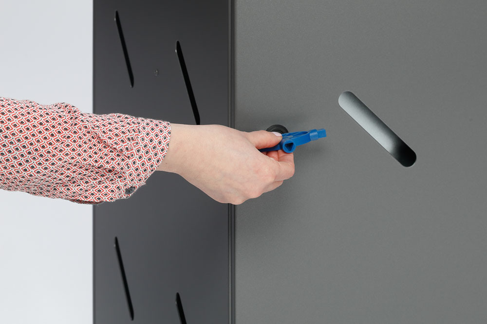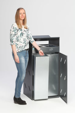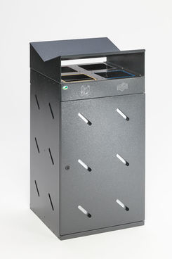 Gefertigt aus hochwertigen, verzinkten Stahlteilen. Sehr stabile Ausführung. Für einen optimalen Oberflächenschutz mit einer Pulverbeschichtung auf Polyester-Basis. Ausgerüstet mit vier verstellbaren Füßen für einen guten Niveau-Ausgleich Verschließbar mit Doppelbart-Schloss. Für ein gezieltes Sammeln: Vier Einwurföffnungen mit farbigen Ringen und Piktogramm-Aufklebern: silber = Restmüll, deep brown = Bio-Müll, enzianblau = Papier, gelb = Wertstoffe. Zum Lieferumfang gehören vier Inneneinsätze aus verzinktem Stahlblech mit Bügelgriffen, mit je ca. 50 ltr. Inhalt und ein Schlüssel. Inneneinsätze geeignet für 120-l Abfallsäcke.