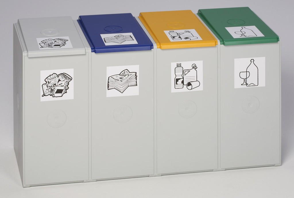 Die Trennung der unterschiedlichen Wertstoffe erfolgt durch die verschiedenfarbige Deckel aus schlagzähem Polysterol.
