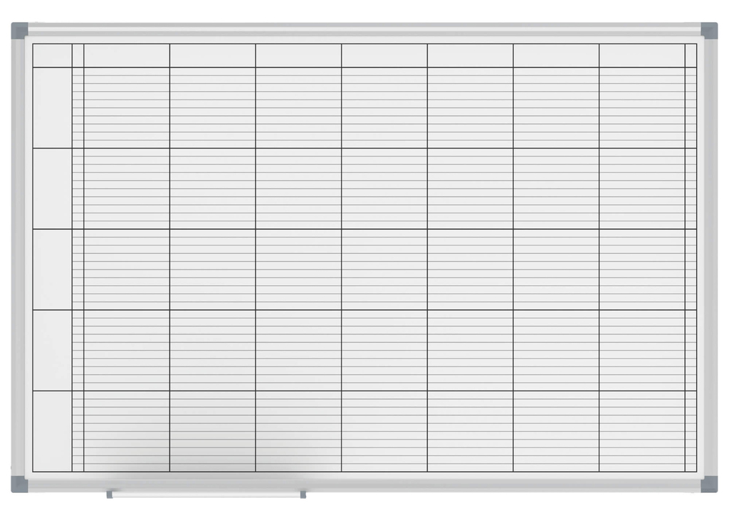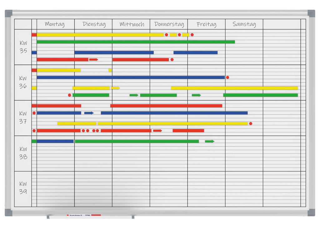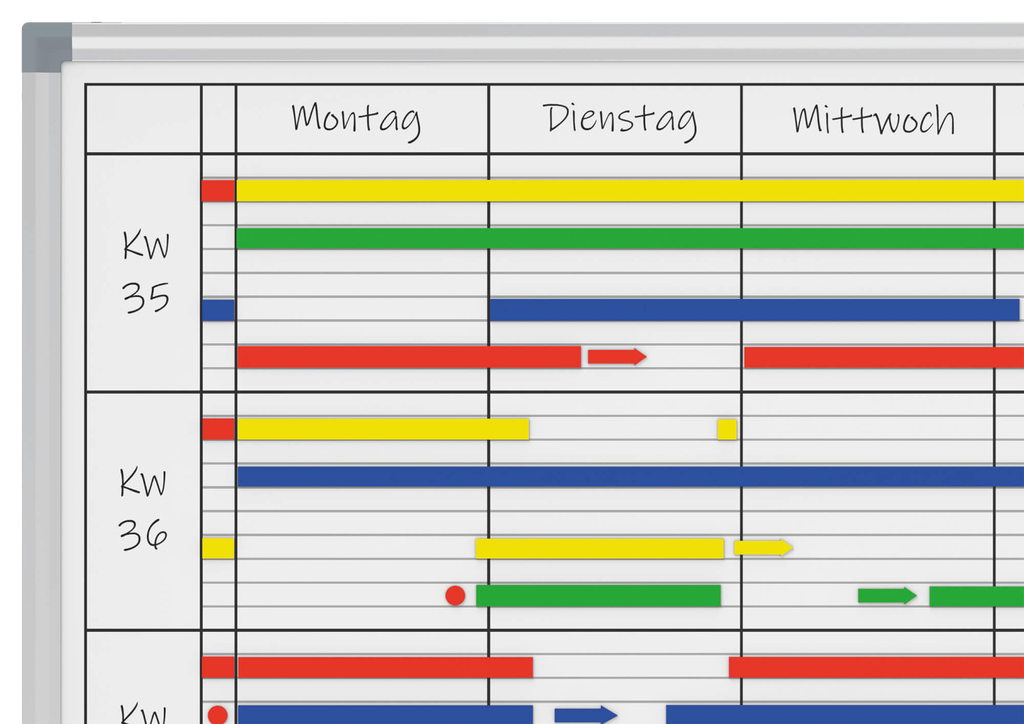 Großzügige Felder für individuelle Eintragungen. Für eine moderne, flexible und schnelle Organisation. Selbst komplexe Planungen und Arbeitsabläufe sind schnell überschaubar. Schnelle Veränderungen möglich. Leichtgewicht: Gut zu transportieren und zu montieren. Für Wochen und Monate mit Arbeitsstundeneinteilung.