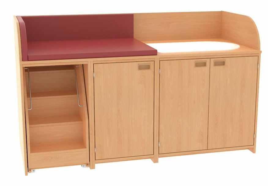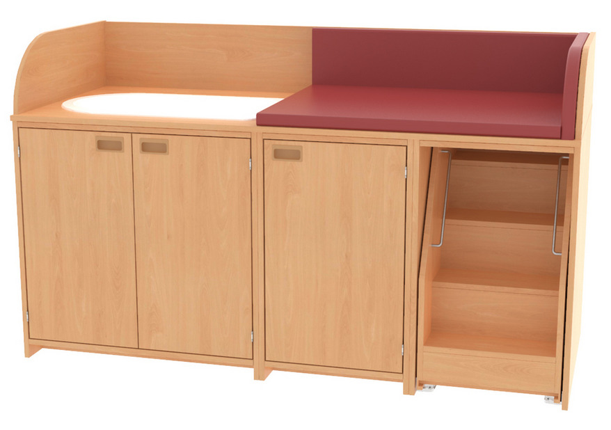 Die Bade- und Wickelkommode bietet großzügigen Platz und Funktionalität für die tägliche Pflege Ihres Babys. Bietet sie ausreichend Platz für alle wichtigen Wickel- und Pflegeutensilien. Die Kommode verfügt über eine 3-seitige Aufkantung oben, die für zusätzliche Sicherheit beim Wickeln sorgt. An den Seiten befinden sich entweder eine fahrbare Treppe oder 2 Türen mit jeweils 2 Einlegeböden, um alle benötigten Utensilien griffbereit zu halten. Darüber befindet sich ein Badebecken aus Mineralstoff, das eine komfortable Möglichkeit bietet, Ihr Baby zu baden. In der Mitte der Kommode befindet sich eine Tür mit weiteren 2 Einlegeböden für zusätzlichen Stauraum. Diese Bade- und Wickelkommode ist die ideale Lösung für Eltern, die nach einer praktischen und geräumigen Pflegestation suchen.