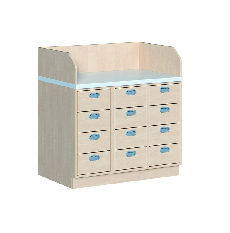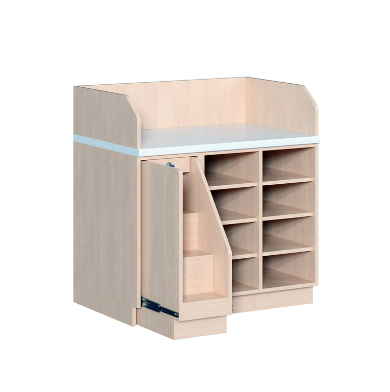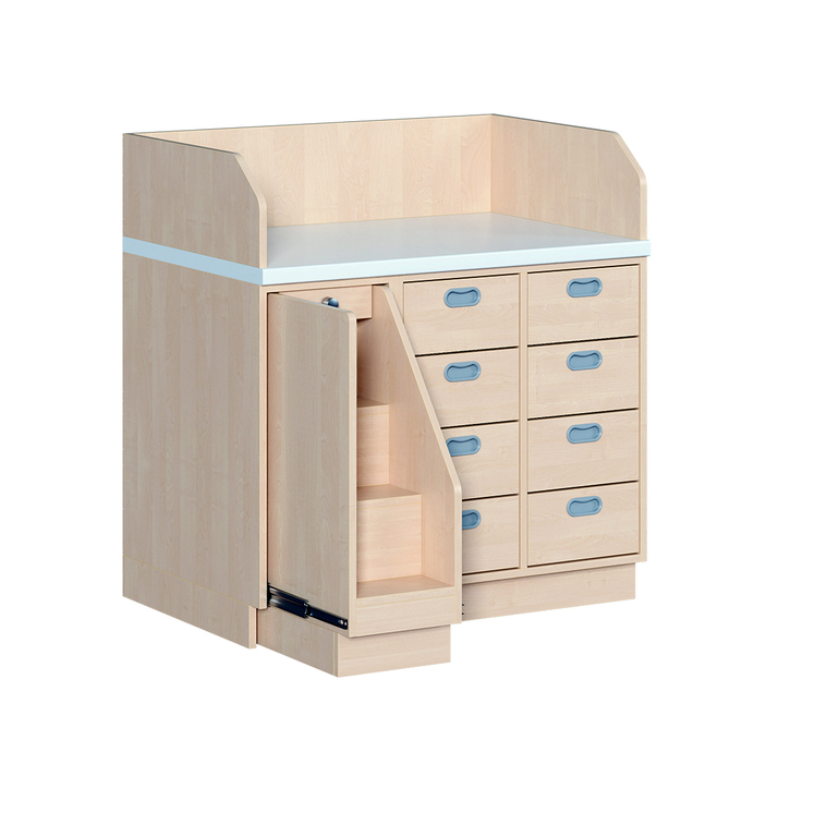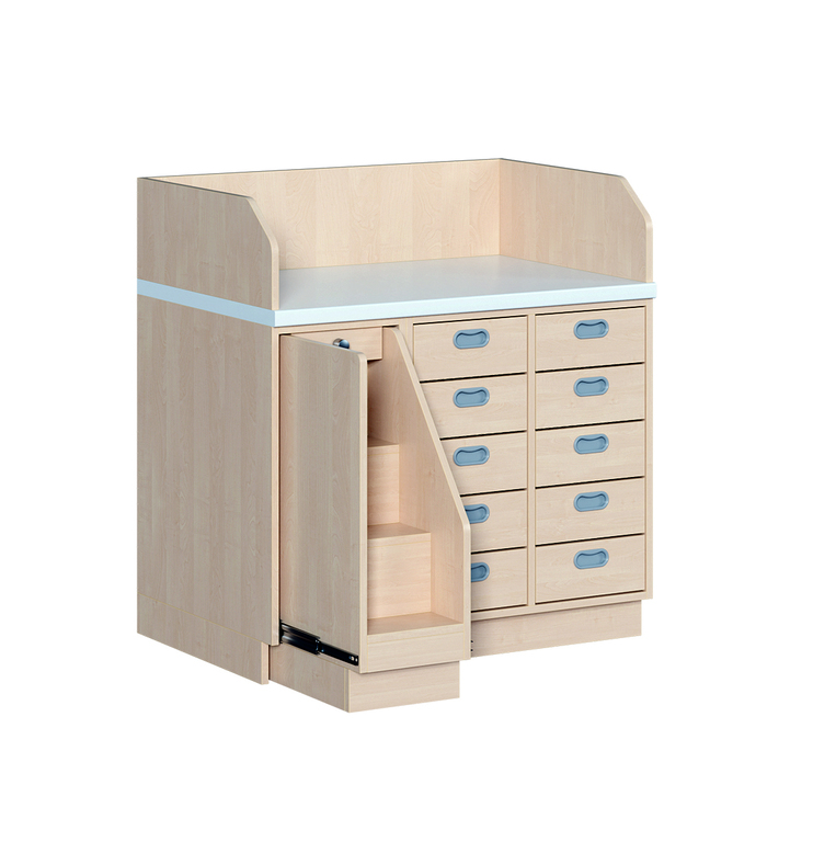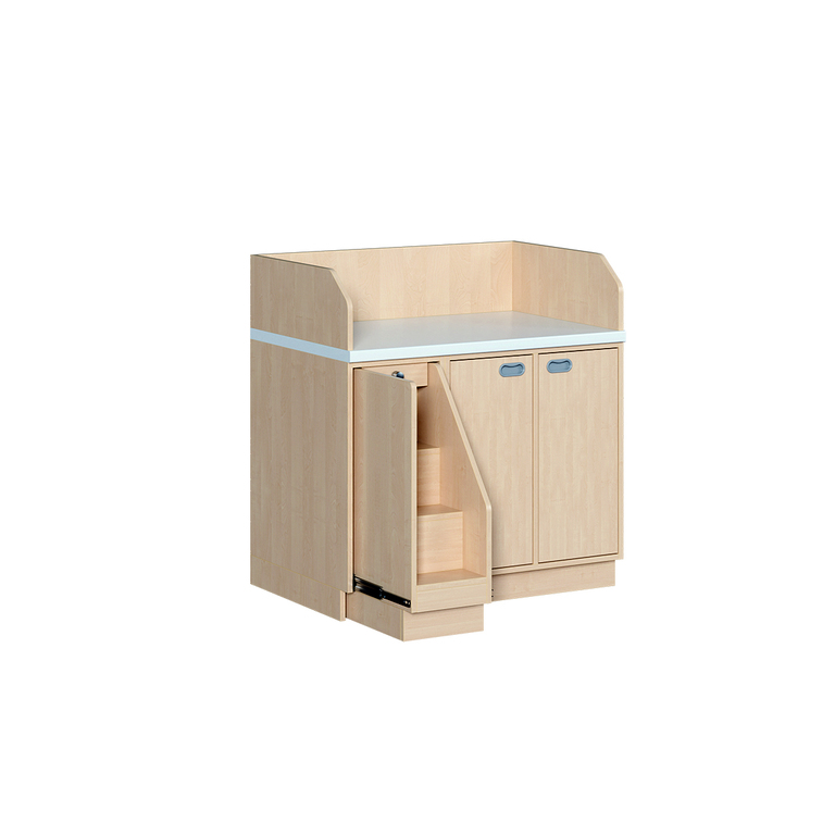 Unsere Wickelkommoden werden mit einer robusten Arbeitsplatte in weiß mit stark gerundeter Vorderkante gefertigt.