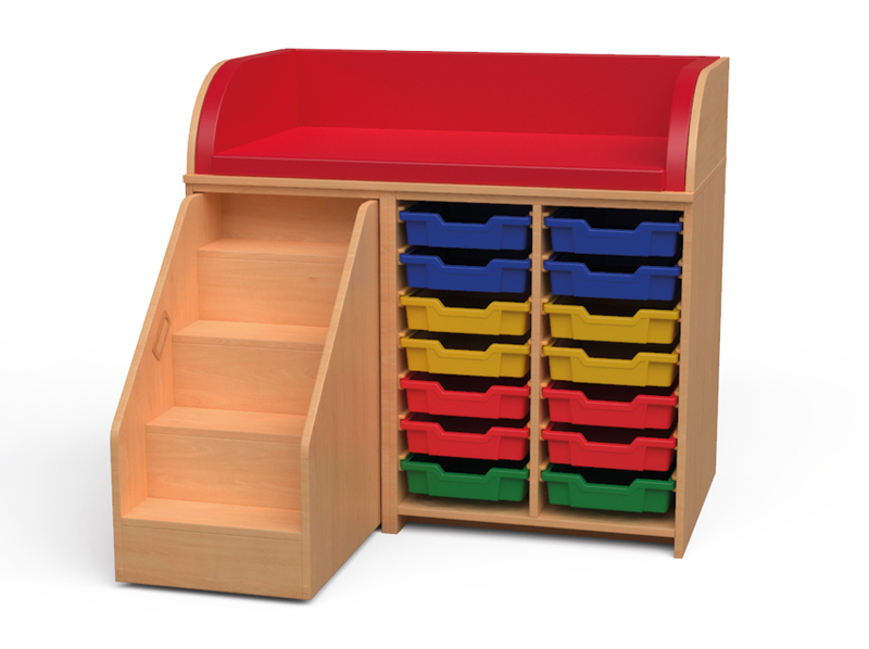 Die Wickelkommode mit Treppe, 120 cm Breite, ist eine äußerst praktische und platzsparende Lösung für Kinderzimmer oder Kindertagesstätten. Sie ist in zwei Varianten erhältlich, wobei oben eine 3-seitige Aufkantung offen ist. Unten links befindet sich entweder eine fahrbare Treppe, die den Zugang zur Wickelstation erleichtert, während rechts 2 x 7 Kunststoffkästen Platz für eine geordnete Aufbewahrung von Windeln, Kleidung und anderen Pflegeprodukten bieten. Alternativ sind auch Varianten erhältlich, bei denen die Kunststoffkästen links angeordnet sind und die Treppe rechts steht. Diese Wickelkommode vereint praktischen Stauraum mit einer bequemen Möglichkeit zum Windelnwechseln, wodurch sie eine unverzichtbare Ergänzung für die Pflege und Organisation von Babysachen darstellt.