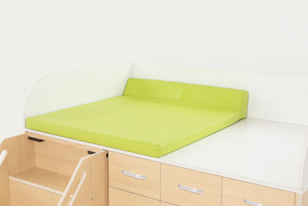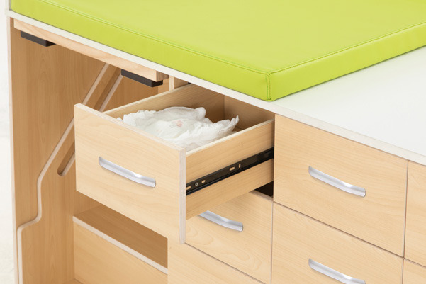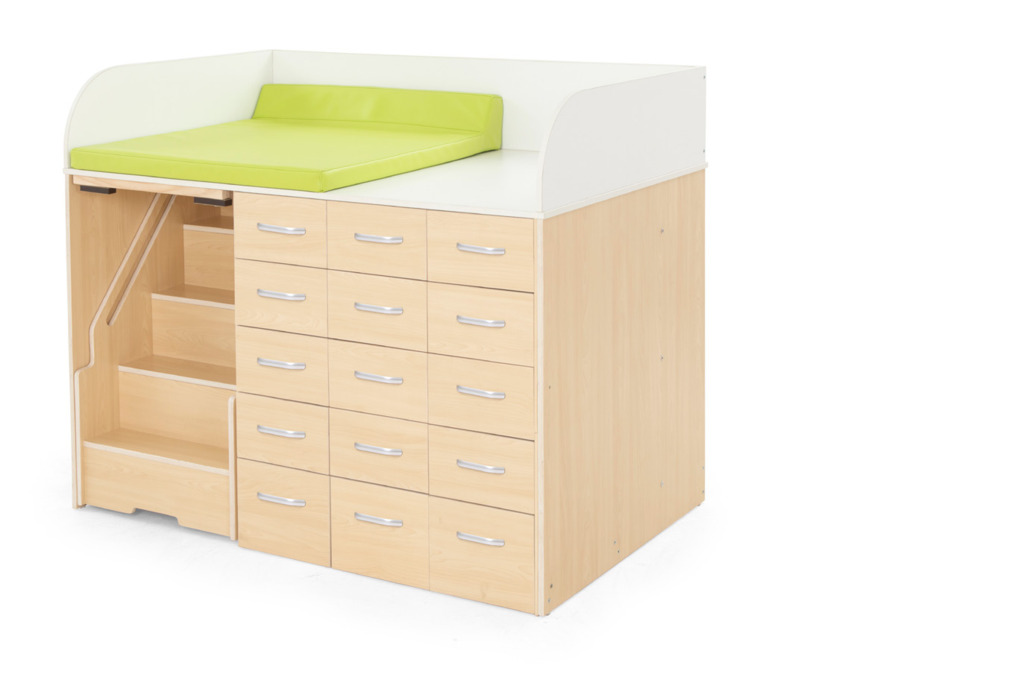 Die vielseitige Wickelstation wurde speziell für den Einsatz in Kindertagesstätten konzipiert. Sie ist stabil und langlebig und besteht aus einer umrandeten Wickelfläche mit bequemer und hygienischer Wickelauflage, einer einschiebbaren Treppe mit Seitengeländer und 15 Fächern mit Schubladen. Die Treppe kann wahlweise auf der rechten oder linken Seite montiert werden.