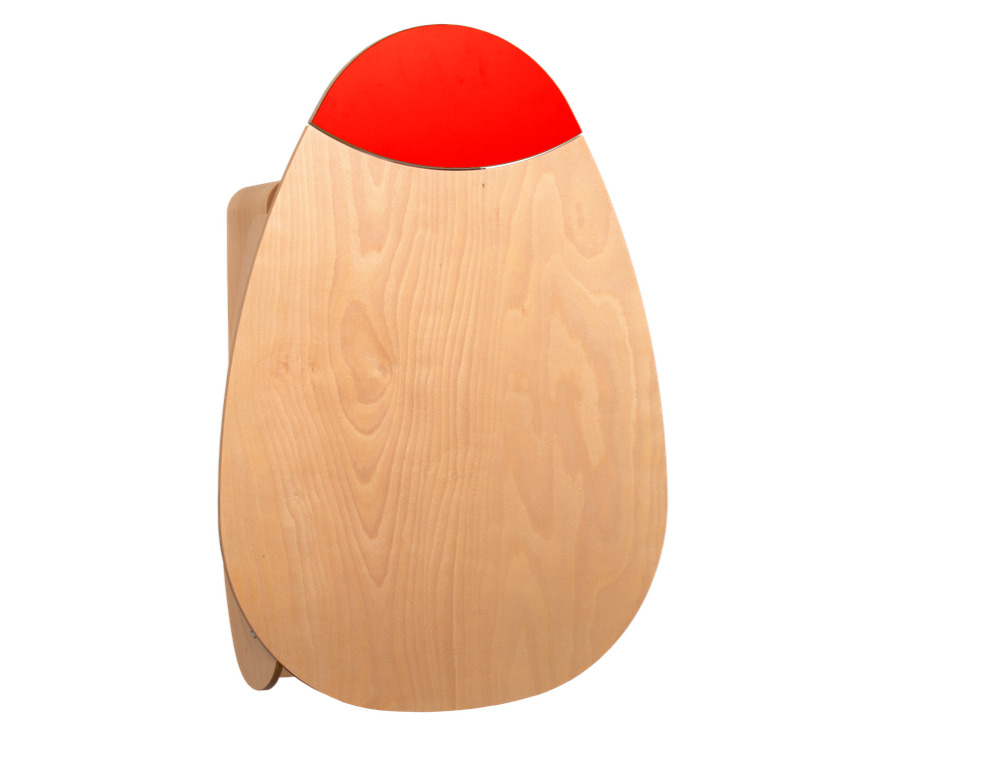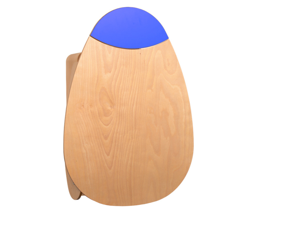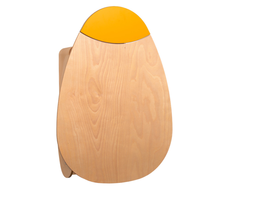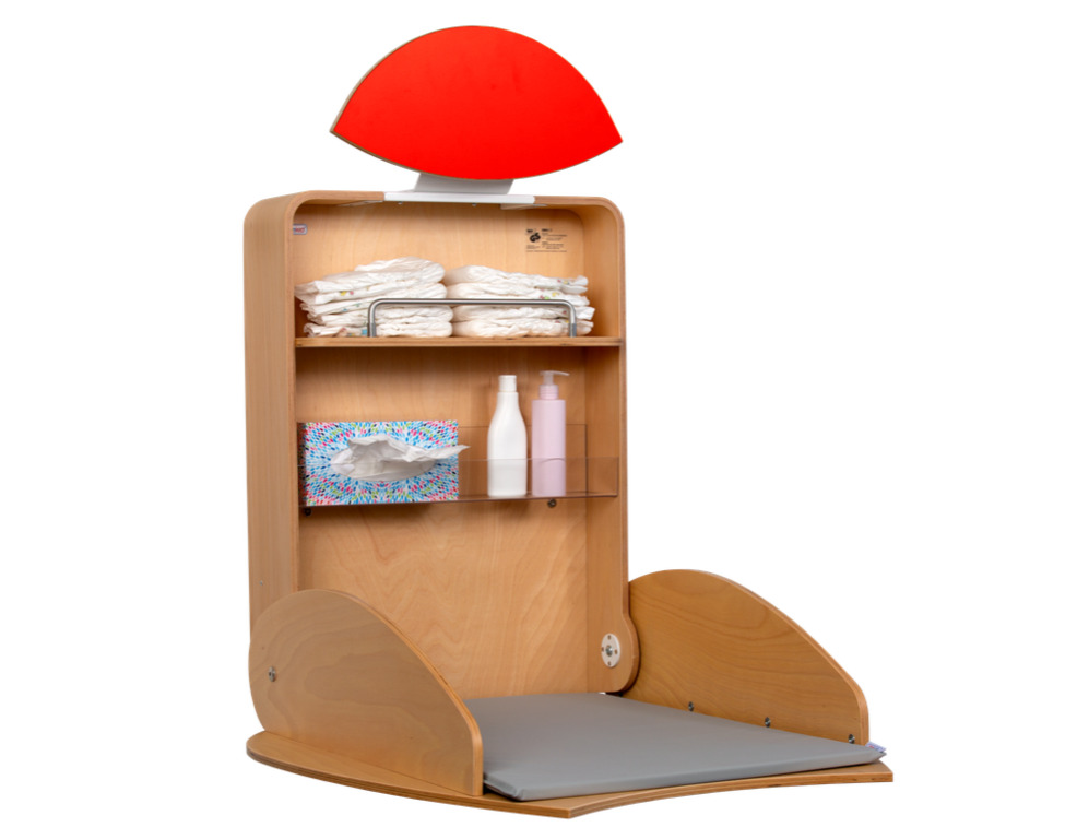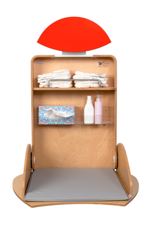 Der Wandwickelplatz ist platzsparend und stabil. In geschlossenem Zustand hat er die Form eines Eis.