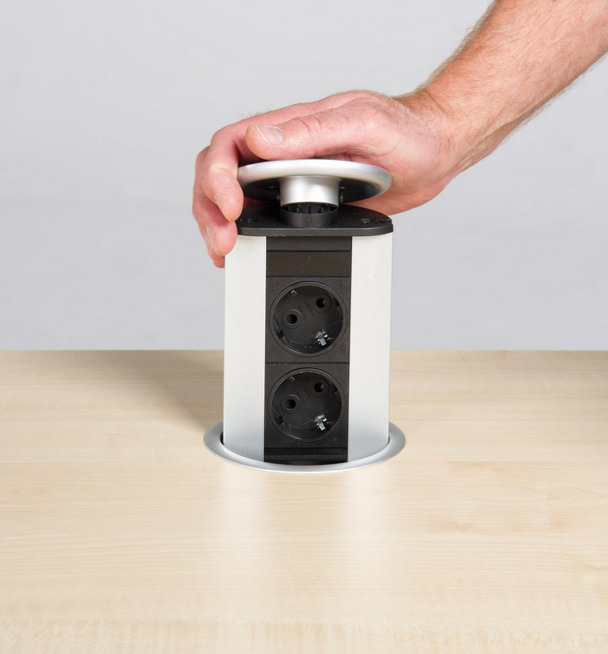 Versenkbare Tischeinheit mit praktischen Anschlüssen für viele Geräte. Mit dieser versenkbaren Multifunktionseinheit vermeiden Sie unnötiges Kabel-Chaos auf Ihrem Schreibtisch. Die komplette Einheit kann bei Bedarf leichtgängig in den Tisch eingelassen oder herausgezogen werden. Dank der modernen Abdeckplatte kann die Einheit komplett im Tisch versenkt werden - so steht die Steckerleiste nicht im Weg.